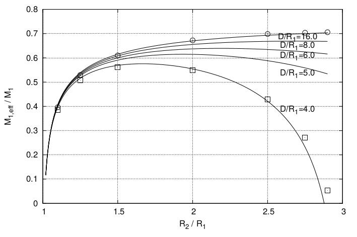 In a first approximation we use Eq. (\ref{eq:ring-vector-potential-elliptic}) to represent the field of the first loop and calculate the flux induced over a Kreisringsektor defined by the outer radius \(D+R_2\), the inner radius \(D-R_2\) and the aperture angle \(\gamma\): \[\begin{align} \label{eq:2rings-mutual-ring-sector} %\lefteqn{M_{dr} \approx} \\ M_{dr} &\approx -\frac{\gamma}{I_o}\left[ (D+R_2)\underline{A}_\phi(D+R_2) - (D-R_2)\underline{A}_\phi(D-R2) \right] \mathcal{Q} \\ \mathcal{Q} &= \frac{R_2^2 \pi}{\frac{\gamma}{2}[(D+R_2)^2 - (D-R_2)^2]} \ .\nonumber \\ \gamma &= 2\arctan(R_2/D) \nonumber \end{align}\] where the factor \(\mathcal{Q}\) is used to scale the Kreisringsector area so as to make it equal to the one of the ring.