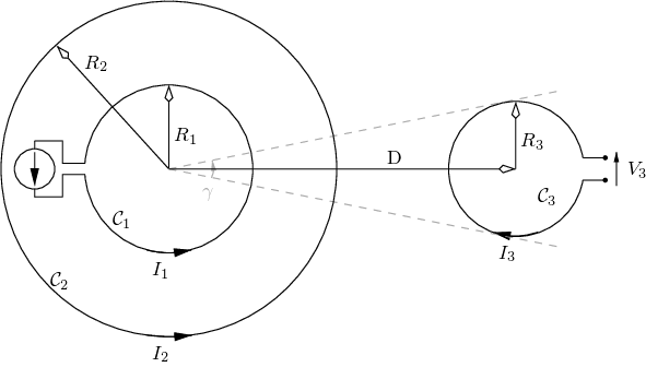 For a quantitative analysis consider the situation depicted in Figure 3 where ring \(\mathcal{C}_1\) is inside and concentric with a second closed ring \(\mathcal{C}_2\) and \(\mathcal{C}_3\) is a third open ring at a center-to-center distance \(D\) from the other two. Ring \(\mathcal{C}_1\) represents an inductor used in a large-signal circuit and should be isolated as best as possible from \(\mathcal{C}_3\) which represents the inductor used in a sensitive circuit. Ring \(\mathcal{C}_2\) should act as a magnetic shield an reduce the mutual coupling between \(\mathcal{C}_1\) and \(\mathcal{C}_3\). Note that, due to reciprocity, the roles of \(\mathcal{C}_1\) and \(\mathcal{C}_3\) can be exchanged.