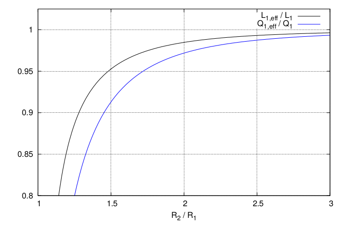 The first chase is where \(R_2/R_1\) is close to 1. In this case however, the shield has a strong undesired impact on the self-inductance of \(\mathcal{C}_1\) as well.